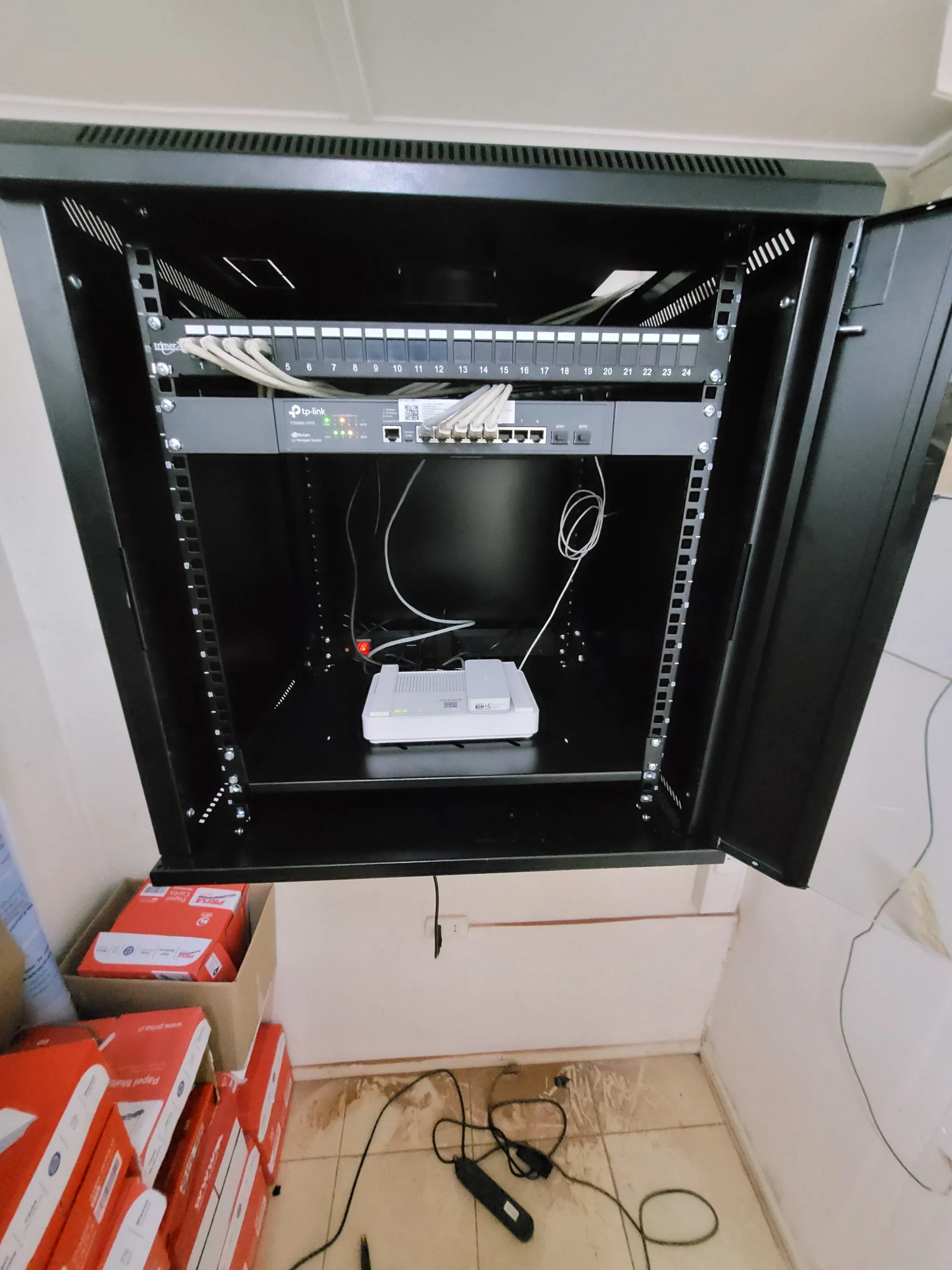Armado y organización de racks para equipos de red, garantizando accesibilidad y buena ventilación.
